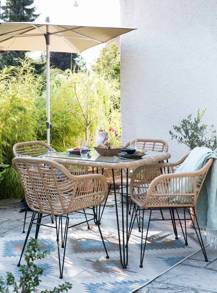 - Tischplatte aus PE-Geflecht in naturfarbe und transparentem Glas