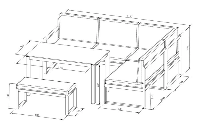 - Set besteht aus 3-Sitzer, 2-Sitzer, Bank und Tisch