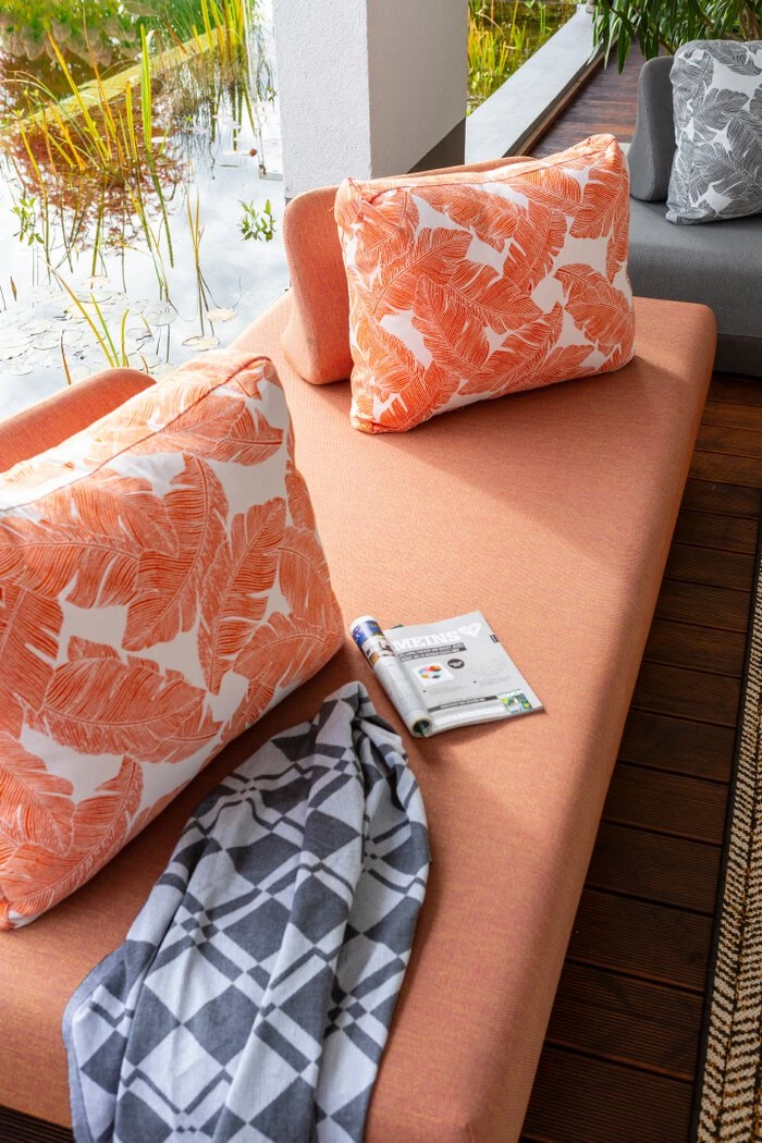 - Jedes Kissen besteht aus einem RĂŒckenblock und einem Kissen in cayenne, sind mit einem ReiĂverschluss verbunden