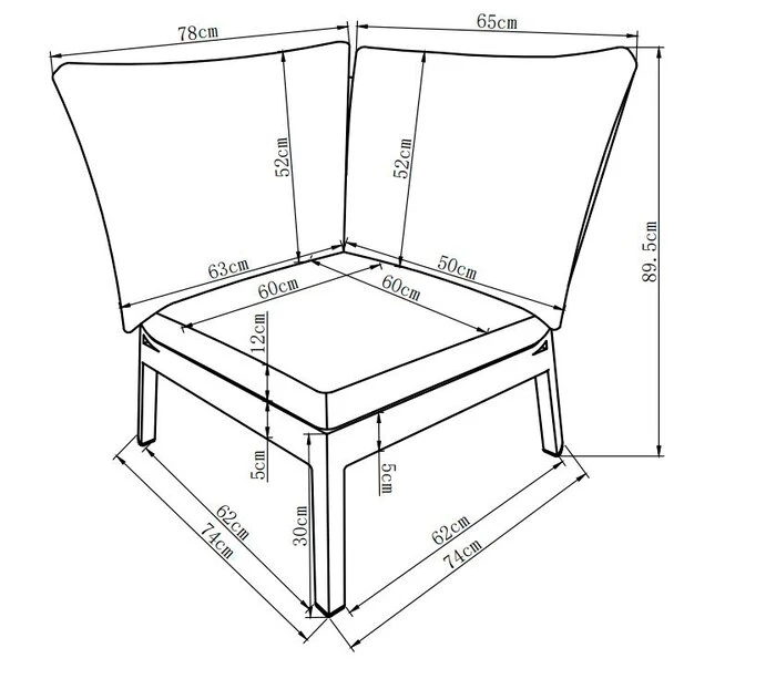 Sitzhöhe 33 cm; Sitztiefe: 60/57 cm; Sitzbreite 131/64/57 cm