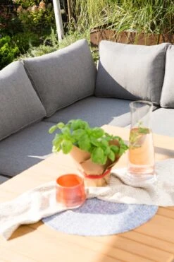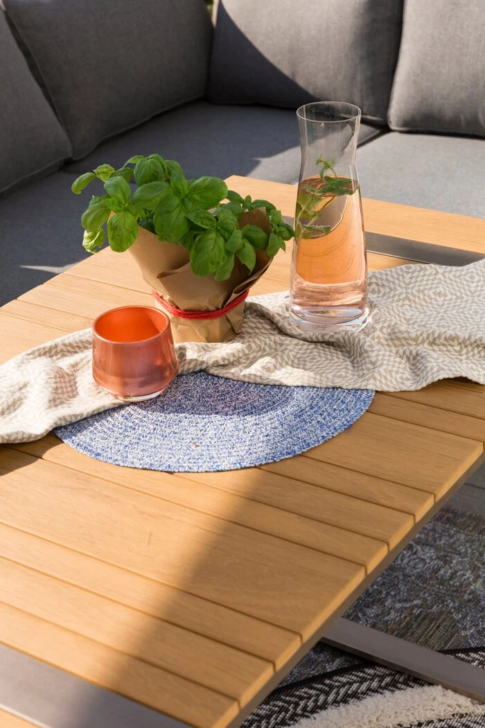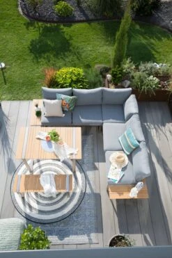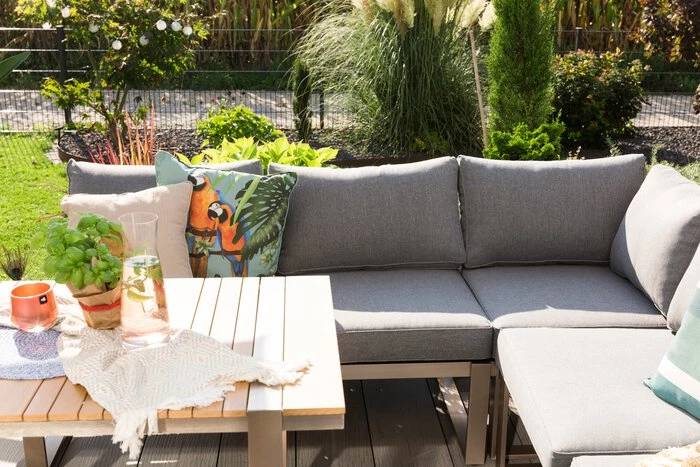 - Set besteht aus Tisch, 2-Sitzer rechts, 2-Sitzer links, Ecke, Bank und Kissenbezug Set in grau und grĂŒn