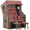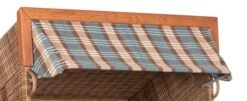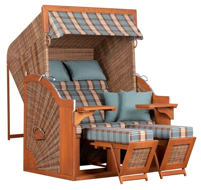 - Inkl. 2 herausziehbare, höhenverstellbare und gepolsterte Fußstützen, Oberkorb mit Holzleiste, 2 schwenkbare Cocktailtische, abnehmbare Markise, 2 höhenverstellbare Nackenkissen und 2 Knuffelkissen