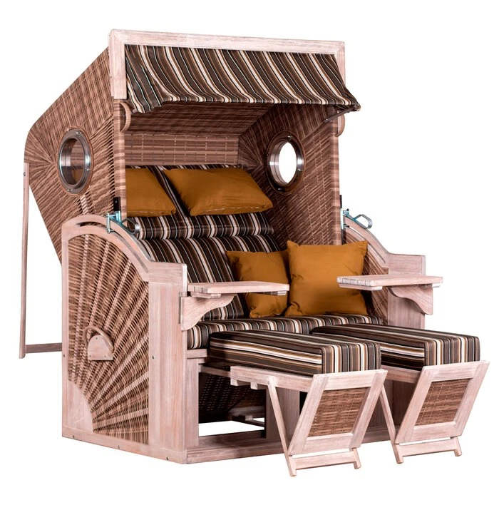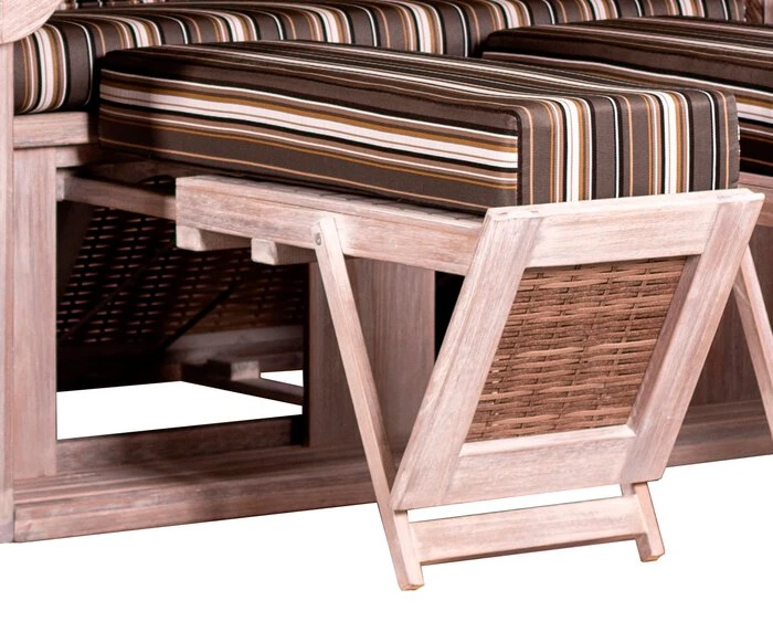 - Inkl. 2 herausziehbare, höhenverstellbare und gepolsterte Fußstützen, Oberkorb mit Holzleiste, 2 schwenkbare Cocktailtische, abnehmbare Markise, 2 höhenverstellbare Nackenkissen und 2 Knuffelkissen