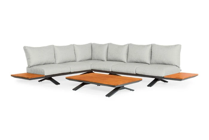 - Set besteht aus 1x 3-Sitzer mit Ecke und Seitentisch, 1x 3-Sitzer mit Seitentisch und 1x Loungetisch