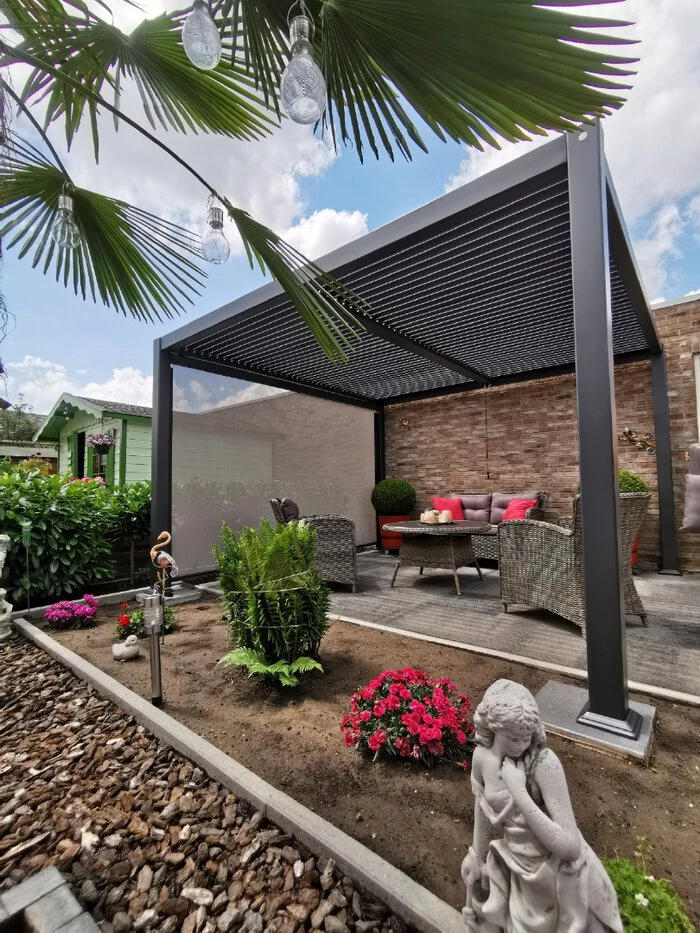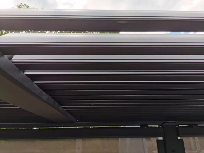 - Mit flexiblen Blenden im Dach ausgestattet, wenn die Blenden geschlossen sind, sind Sie auĂerdem vor Regen geschĂŒtzt. Regenwasser wird ĂŒber die Beine der Konstruktion abgeleitet.
