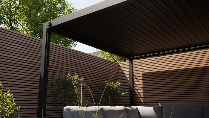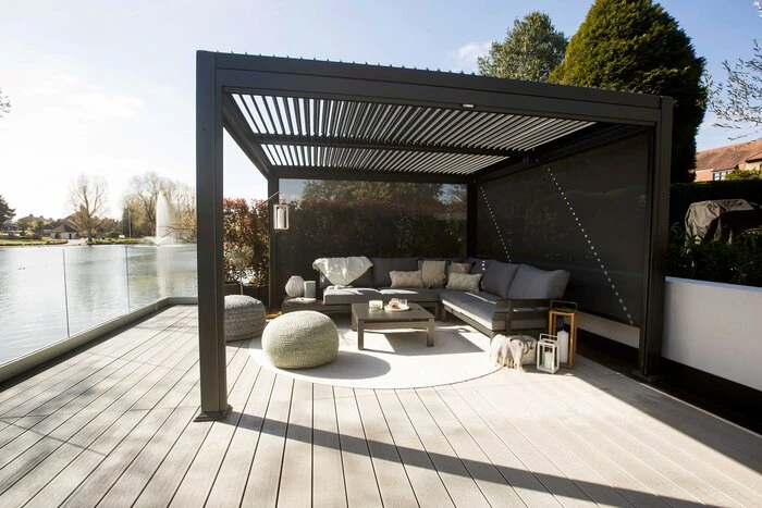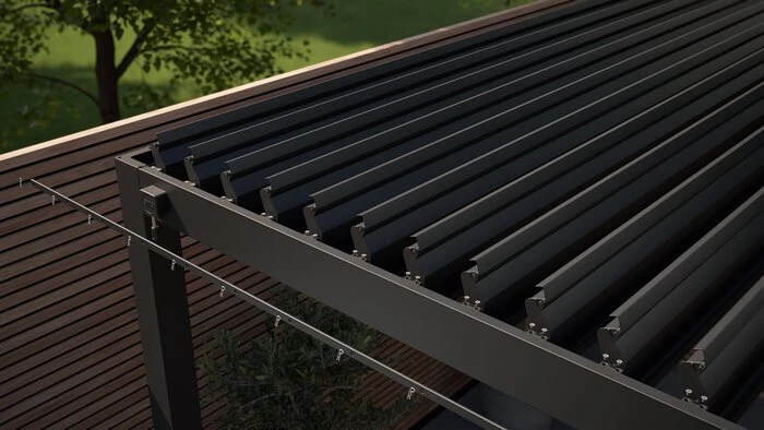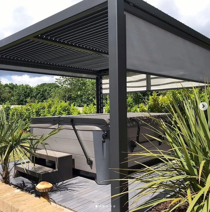 - Mit flexiblen Blenden im Dach ausgestattet, wenn die Blenden geschlossen sind, sind Sie außerdem vor Regen geschützt. Regenwasser wird über die Beine der Konstruktion abgeleitet.