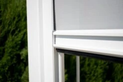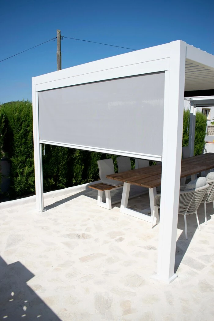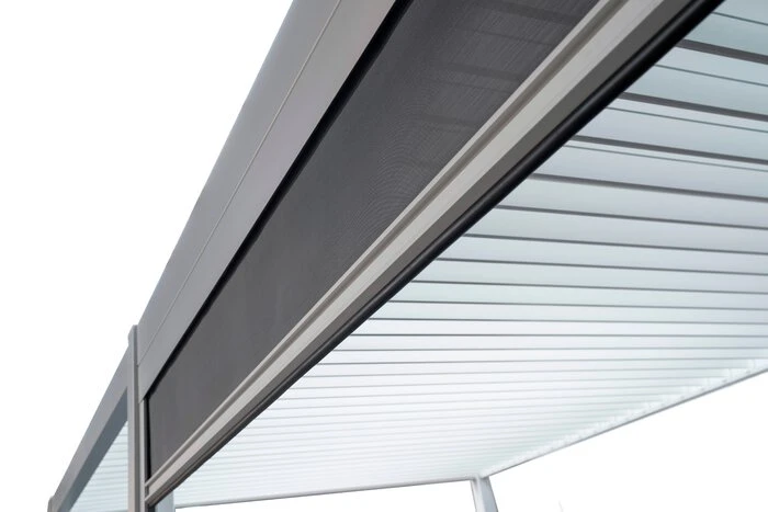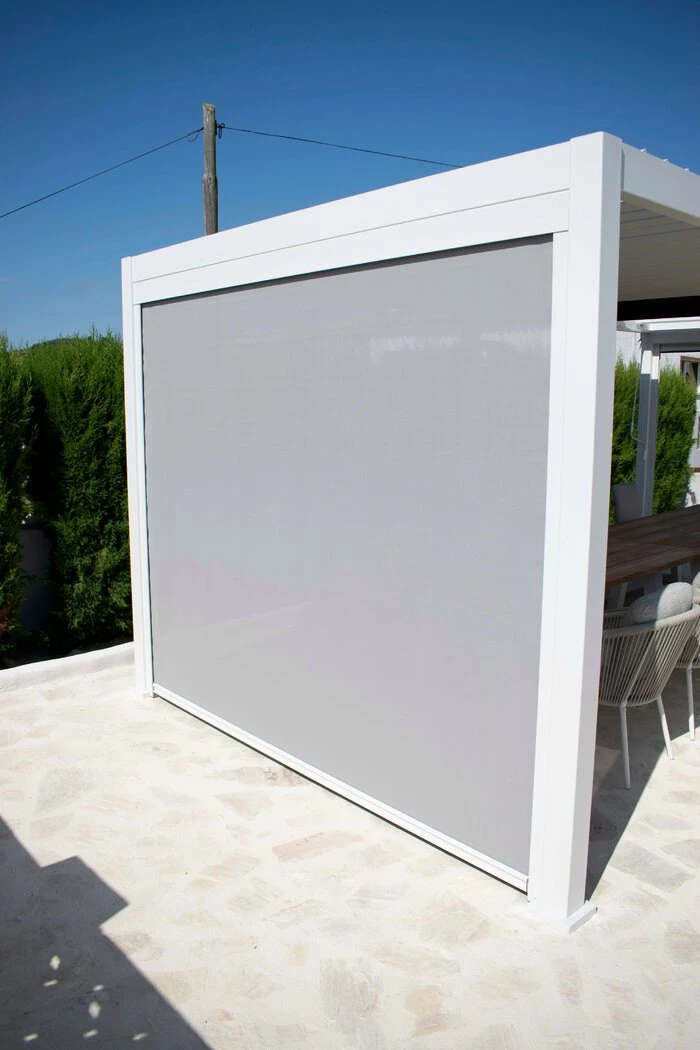 - Roll-Up/Down-Seitenmarkise dient als Wind-, Regen- und Sichtschutz.